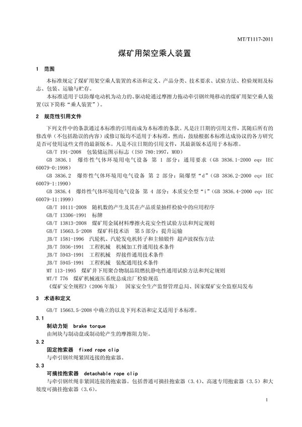 MTT 1117-2011 煤矿用架空乘人装置(非正式版)